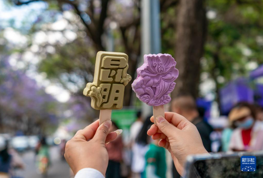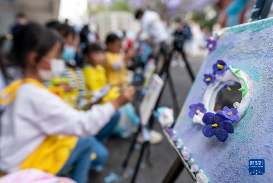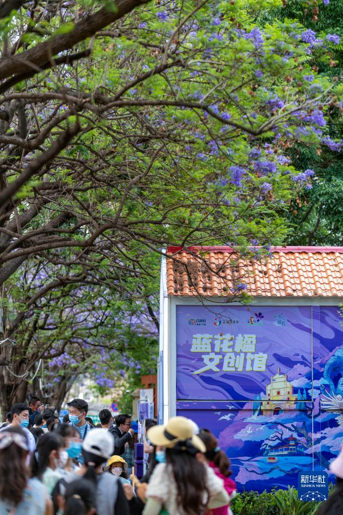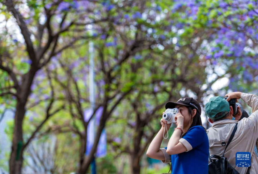 近日,昆明教场中路的蓝花楹进入盛花期,吸引不少市民游客到此“打卡”。近年来,昆明以花为媒,将美景与文旅、文创、文化等结合,为春城花都增添魅力和活力。新华社记者 陈欣波 摄