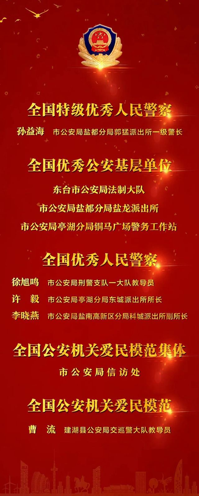 全国公安系统英雄模范立功集体表彰大会上,盐城公安再传喜讯:1名民警被授予“全国特级优秀人民警察”荣誉称号、3个集体获评“全国优秀公安基层单位”、3名民警获评“全国优秀人民警察”,1个集体获评“全国公安机关爱民模范集体”、1名民警获评“全国公安机关爱民模范”。全文阅读