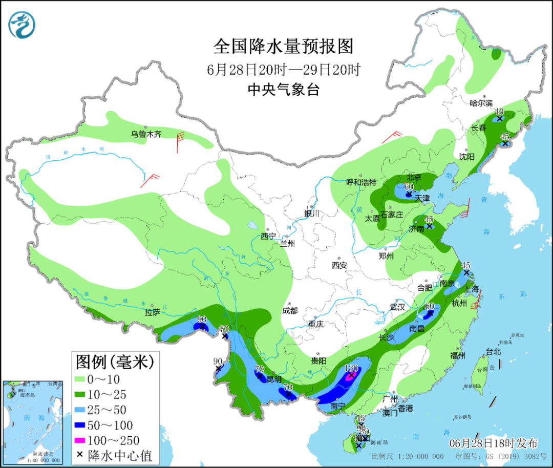 28日20时至29日20时,吉林东部、辽宁东部、山西东部、京津冀、黄淮东部、江淮东部、西南地区南部、川西高原南部、江南北部和西南部、华南西部、西藏东南部等地的部分地区有中到大雨,其中,河北中部、江西北部、广西北部和西部、云南中东部和西部、西藏东南部、海南岛等地局地有暴雨或大暴雨(100~120毫米)。