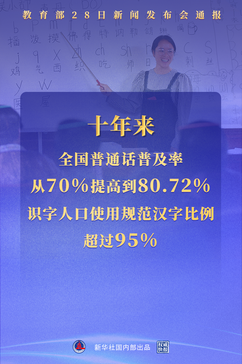 ◎教育部消息,十年来全国普通话普及率从70%提高到80.72%,识字人口使用规范汉字比例超过95%。