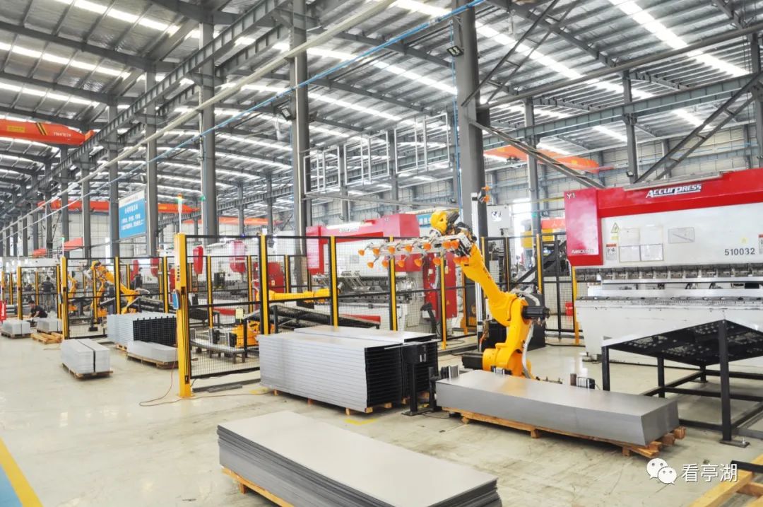 近日,在和阳电梯配件二期项目全自动门板生产线上,机械手臂吸起重重的钢板,左右摆动,准确地放到冲压位置,完成加工后送至下一道工序。