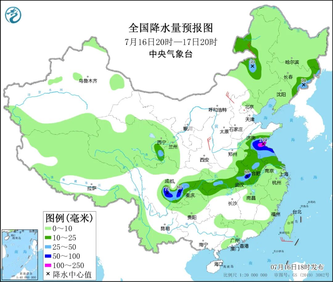 7月16日20时至17日20时,内蒙古东部、黑龙江东南部、吉林东部、山东南部、安徽中北部、江苏中北部、湖北中南部、四川盆地中南部、重庆中部等地有中到大雨,其中,山东南部、江苏北部、安徽大别山区、湖北东北部、四川盆地南部等地的部分地区有暴雨或大暴雨。
