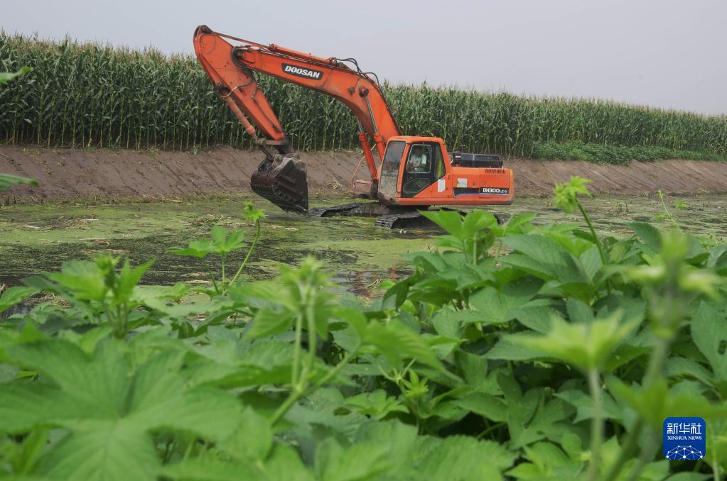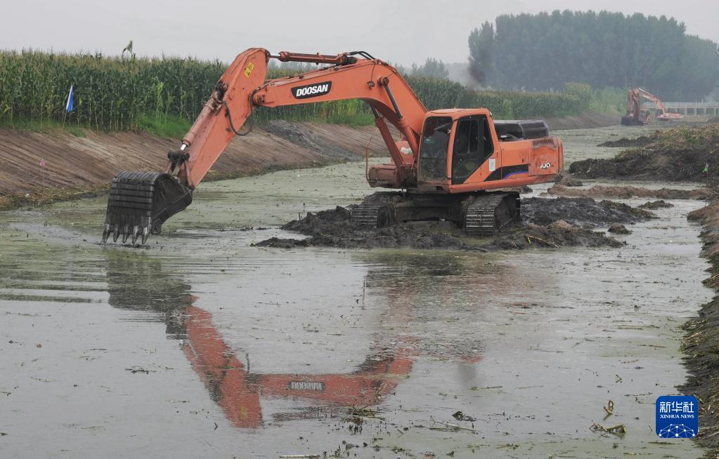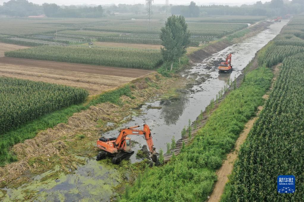 8月6日,工人在昌黎县新集镇境内的引滦河水灌渠清淤现场施工。近日,河北省昌黎县为有效改善水生态环境,实施地下水超采综合治理项目,通过疏浚河道、沟渠清淤,将滦河水引至地下水超采区和禁采区。据介绍,该项目竣工投入使用后,年引滦河水将达5000万立方米,用于6万亩农田灌溉和沿线企业生产。新华社记者 杨世尧 摄
