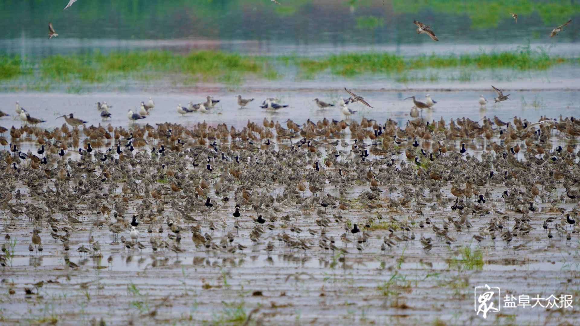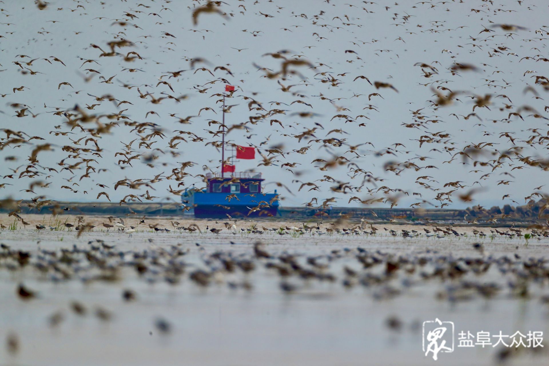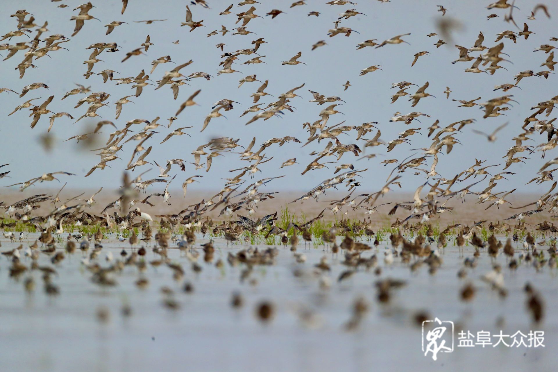 近日,观鸟爱好者发现在我市滩涂湿地上,大批秋迁的候鸟前来“歇脚”“加油”。每年秋季,是鸻鹬类候鸟南迁的高峰期。数以万计的鸟儿会离开俄罗斯北部、西伯利亚以及阿拉斯加等繁殖地,长途跋涉,飞往澳大利亚、新西兰、东南亚等地越冬。而江苏沿海的滩涂,就成为了它们迁徙途中的必经之地,盐城黄海湿地更是其中最为重要的中转站之一,鸟儿们将在这里停歇休整,补充能量。八月底九月初,盐城黄海湿地将迎来候鸟们的过境高峰,数百万只候鸟将在这片神奇湿地息壤上,收拾好“行囊”,准备飞往下一个诗和远方。图为数以万计的鸻鹬类候鸟飞临盐城黄海湿地。李东明 盐阜大众报报业集团融媒体记者 周晨阳 摄