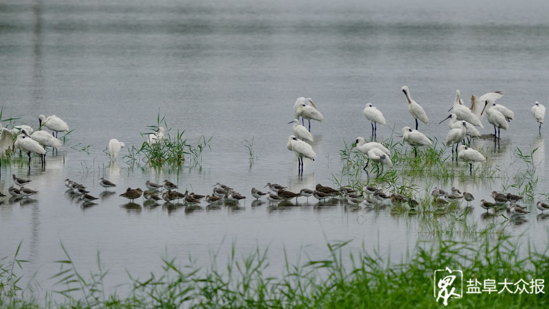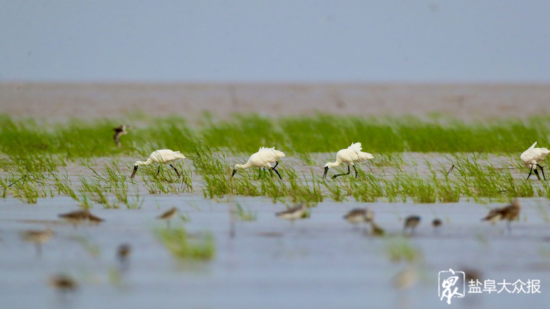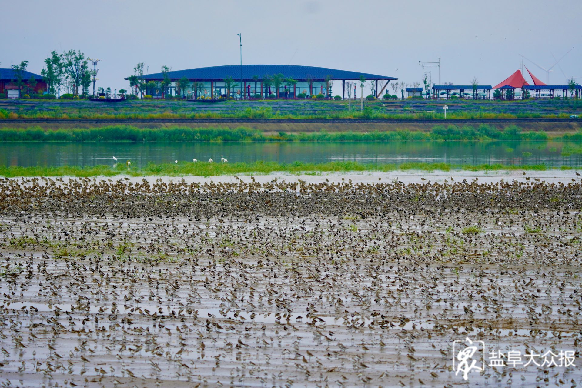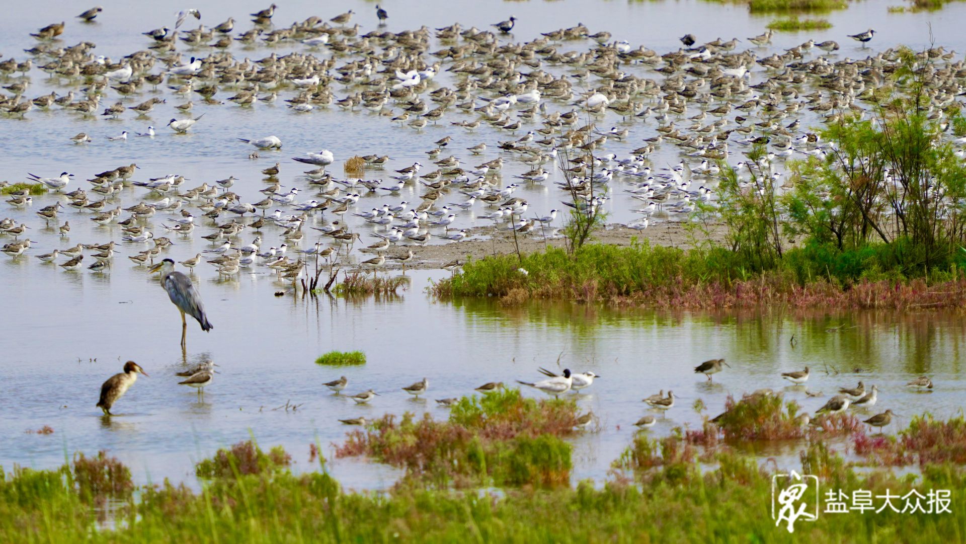 近日,观鸟爱好者发现在我市滩涂湿地上,大批秋迁的候鸟前来“歇脚”“加油”。每年秋季,是鸻鹬类候鸟南迁的高峰期。数以万计的鸟儿会离开俄罗斯北部、西伯利亚以及阿拉斯加等繁殖地,长途跋涉,飞往澳大利亚、新西兰、东南亚等地越冬。而江苏沿海的滩涂,就成为了它们迁徙途中的必经之地,盐城黄海湿地更是其中最为重要的中转站之一,鸟儿们将在这里停歇休整,补充能量。八月底九月初,盐城黄海湿地将迎来候鸟们的过境高峰,数百万只候鸟将在这片神奇湿地息壤上,收拾好“行囊”,准备飞往下一个诗和远方。图为数以万计的鸻鹬类候鸟飞临盐城黄海湿地。李东明 盐阜大众报报业集团融媒体记者 周晨阳 摄