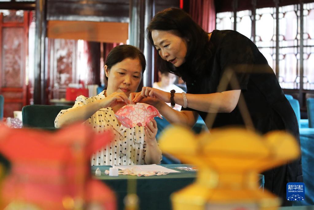 9月6日,在江苏省苏州市古典园林留园,苏州灯彩非遗传承人汪丽秋(右)指导体验者制作苏式花灯。中秋临近,各地举办活动迎佳节。杭兴微/摄