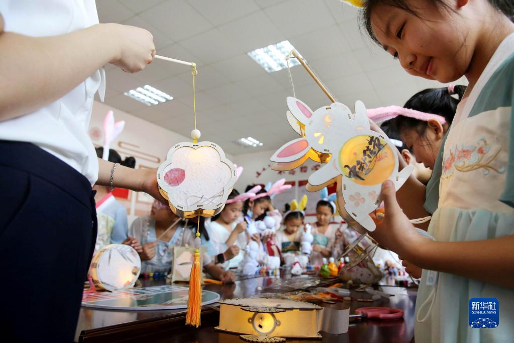 9月6日,小朋友在江苏省连云港市连云区墟沟街道桃园社区拼装花灯。中秋临近,各地举办活动迎佳节。朱华南/摄