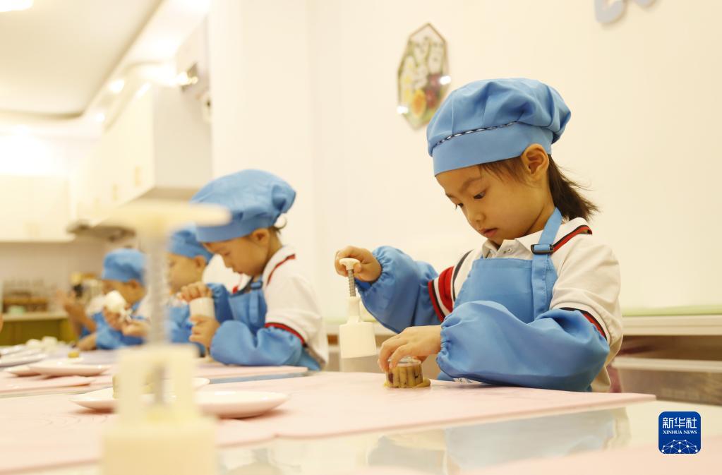 9月6日,河北省邢台市襄都区第七幼儿园的小朋友在“学做中秋月饼 体验传统文化”主题活动中学习制作月饼。中秋临近,各地举办活动迎佳节。张驰/摄