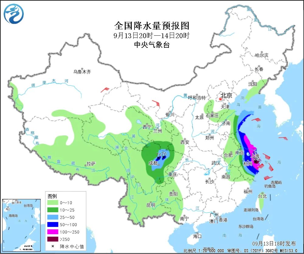 ◎ 中央气象台13日18时发布暴雨黄色预警,预计13日20时至14日20时,浙江中北部、上海、江苏、山东东部、四川盆地西部等地部分地区有大到暴雨,其中,浙江东北部、上海南部、江苏东部等地的部分地区有大暴雨,浙江东北部局地特大暴雨。