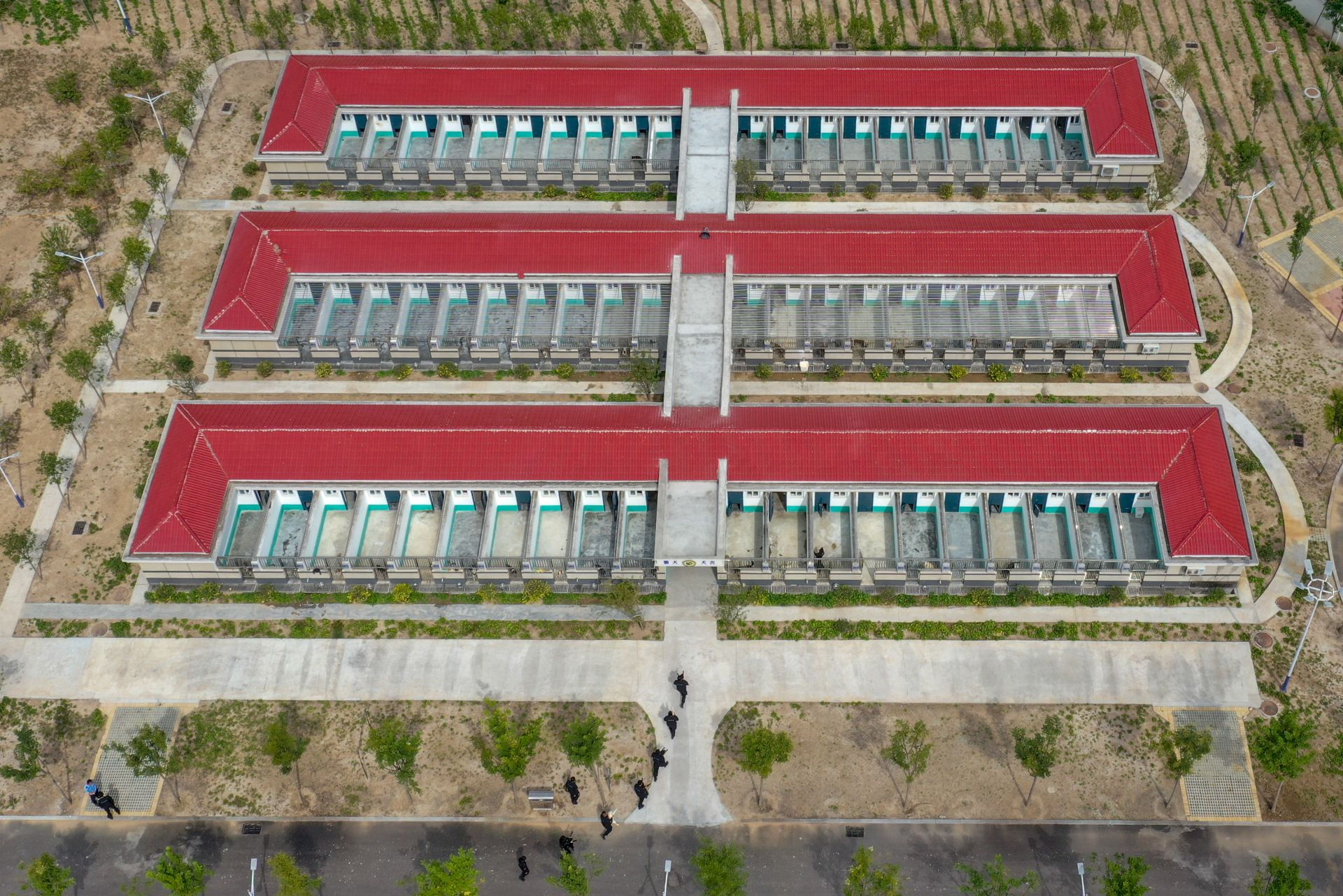 山东省聊城市公安局警犬训练基地标准化工作犬犬舍(9月24日摄,无人机照片)。 近日,在山东省聊城市公安局警犬训练基地,不同类型警犬在训导员带领下开展专项训练,提高专业技能。该基地今年6月投入使用,建有标准化工作犬犬舍64间、草坪训练场、林地搜索训练场、警犬技术综合楼等高标准配套设施,为提高警犬综合素质提供可靠保障。 新华社记者 朱峥 摄