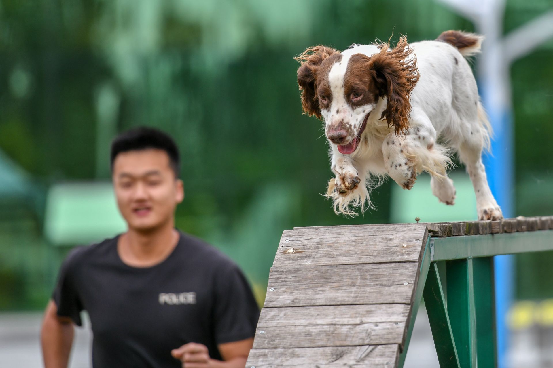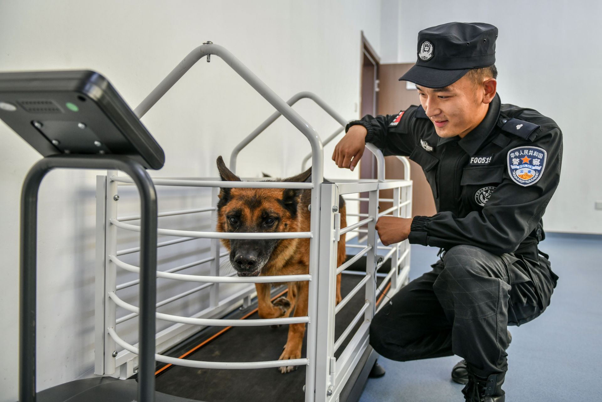 9月20日,训导员冯如真带领追踪犬“阿里”训练体能。