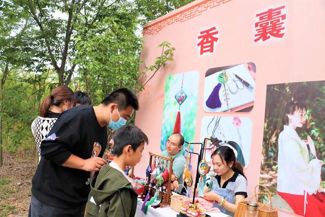 设置在公园乡贤走廊的糖画糖人、香囊、棕编等10个非遗项目展台前游客络绎不绝,小朋友们目不转睛地盯着非遗工艺品,感觉十分新奇。校园优秀书画作品展台前,也吸引了许许多多学生和家长驻足观赏。