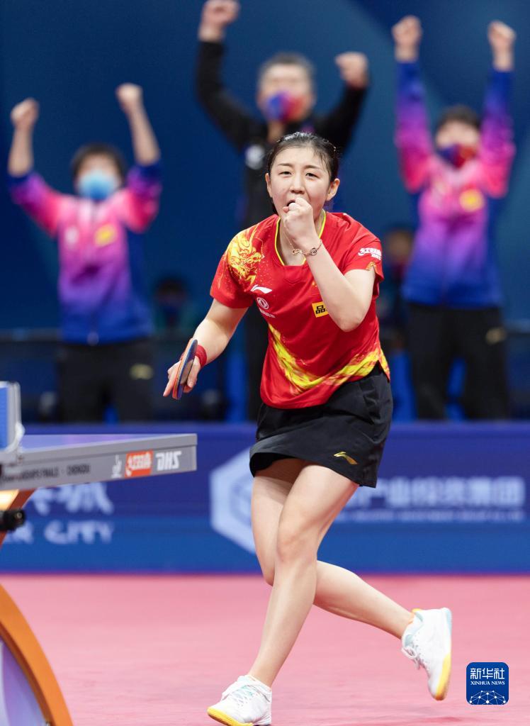 10月8日,中国队选手陈梦在比赛中庆祝,她以3比0战胜日本队选手木原美悠。当日,在成都举行的第56届世界乒乓球团体锦标赛(决赛)女子决赛中,中国队以3比0战胜日本队,夺得冠军。 新华社记者 江宏景 摄