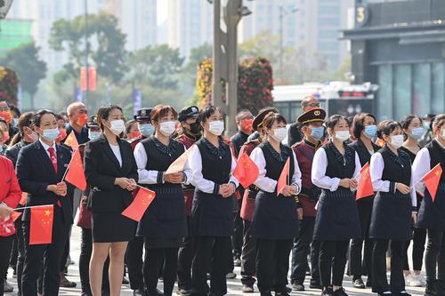 10月16日上午,在欧风花街,不少市民在户外收听收看中国共产党第二十次全国代表大会开幕会。