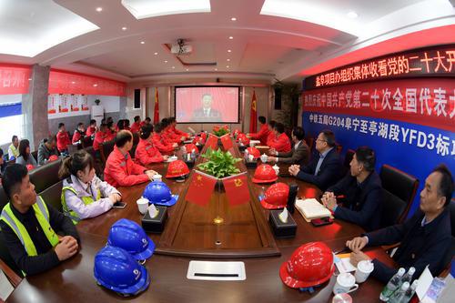 10月16日上午,在204国道盐阜快速通道YFD3标项目经理部会议室,党员一起集中收听收看中国共产党第二十次全国代表大会开幕会。