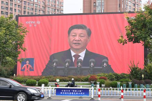 10月16日上午,在开放大道一侧的户外大屏幕,正直播中国共产党第二十次全国代表大会开幕会。