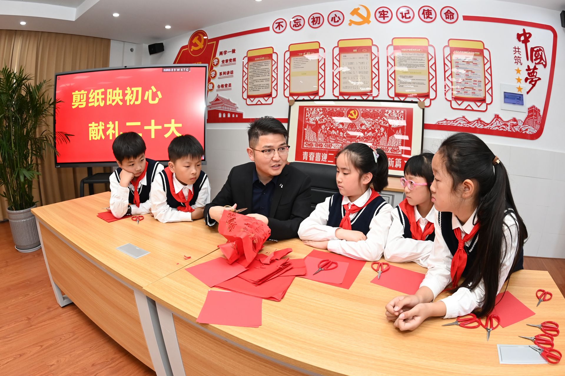 盐城剪纸非遗传承人郑荣军老师带领孩子们一起创作,小小的剪刀剪出了大家热爱党、热爱祖国的浓厚氛围。伟大成就鼓舞人心,使命任务催人奋进。连日来,全市广大党员干部群众认真学习、热烈讨论党的二十大报告,说变化、谈感受,踔厉奋发向未来。记者 李思远 摄