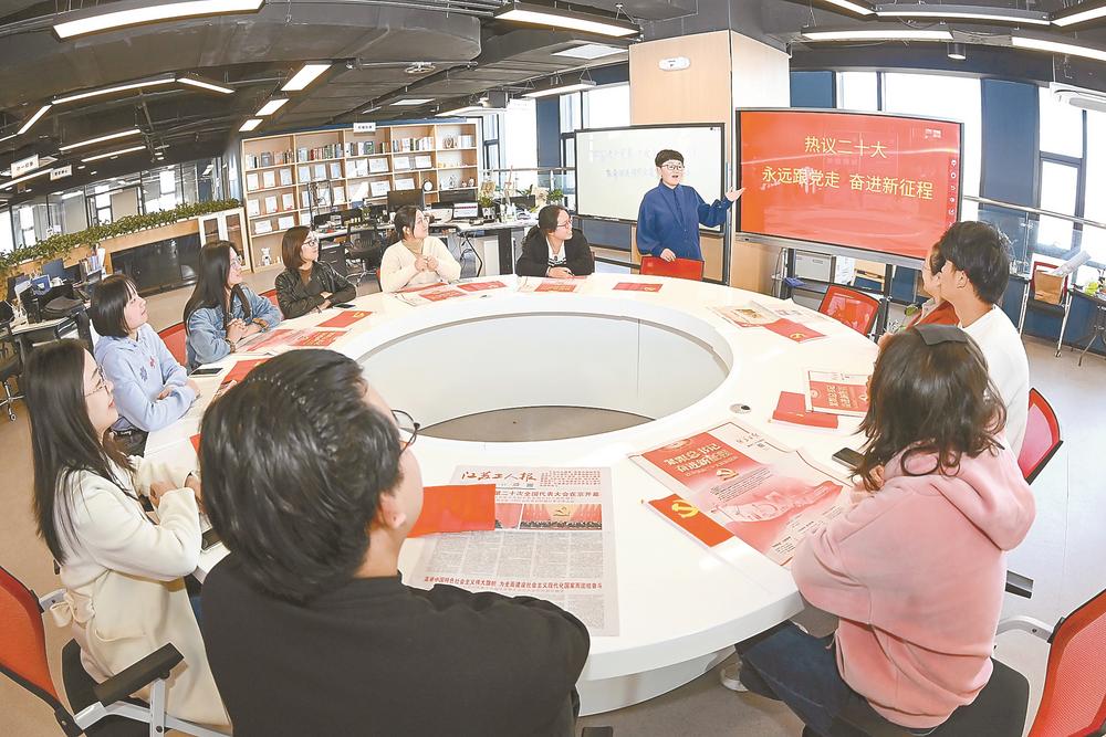 在盐城统战之家,新的社会阶层人士畅谈“我心中的二十大”。伟大成就鼓舞人心,使命任务催人奋进。连日来,全市广大党员干部群众认真学习、热烈讨论党的二十大报告,说变化、谈感受,踔厉奋发向未来。记者 李思远 摄