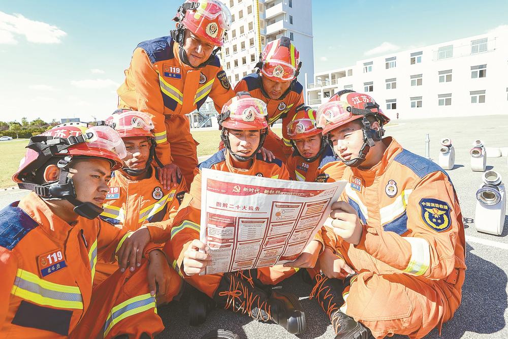 市消防救援支队消防员通过报纸学习党的二十大报告。伟大成就鼓舞人心,使命任务催人奋进。连日来,全市广大党员干部群众认真学习、热烈讨论党的二十大报告,说变化、谈感受,踔厉奋发向未来。记者 李思远 摄