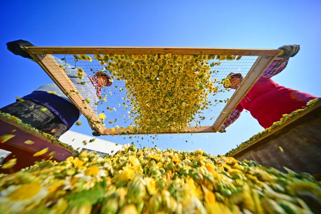 在鹤乡菊海景区附近,还能看到不少村民忙着采摘菊花。“我有时候会摘这些菊花在家里面烘两个小时,就可以变成菊花干泡茶,每天泡一杯神清气爽。”种菊、采菊、闻菊花香、泡菊花茶成了村民们最令人艳羡的日常。他们采集回来汇总拿到工厂烘干加工,统一包装成纯天然药用、茶用菊。一株小小的菊花,成了当地农民增收的“摇钱树”。