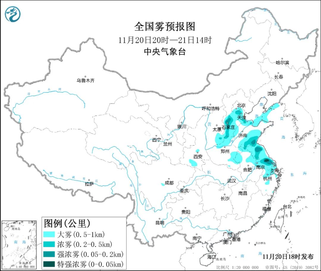 20日夜间至21日上午,北京南部、天津、河北中南部、山东西北部和南部、河南北部和东南部、安徽北部、江苏、上海、浙江北部等地有能见度不足1公里的大雾天气,其中,北京东南部、天津西北部、河北西部、山东南部、河南北部、江苏中北部等地的部分地区有能见度不足200米的强浓雾,局地能见度不足50米。另外,渤海南部海域、渤海海峡和辽东半岛沿岸海域将有能见度不足1公里的大雾。