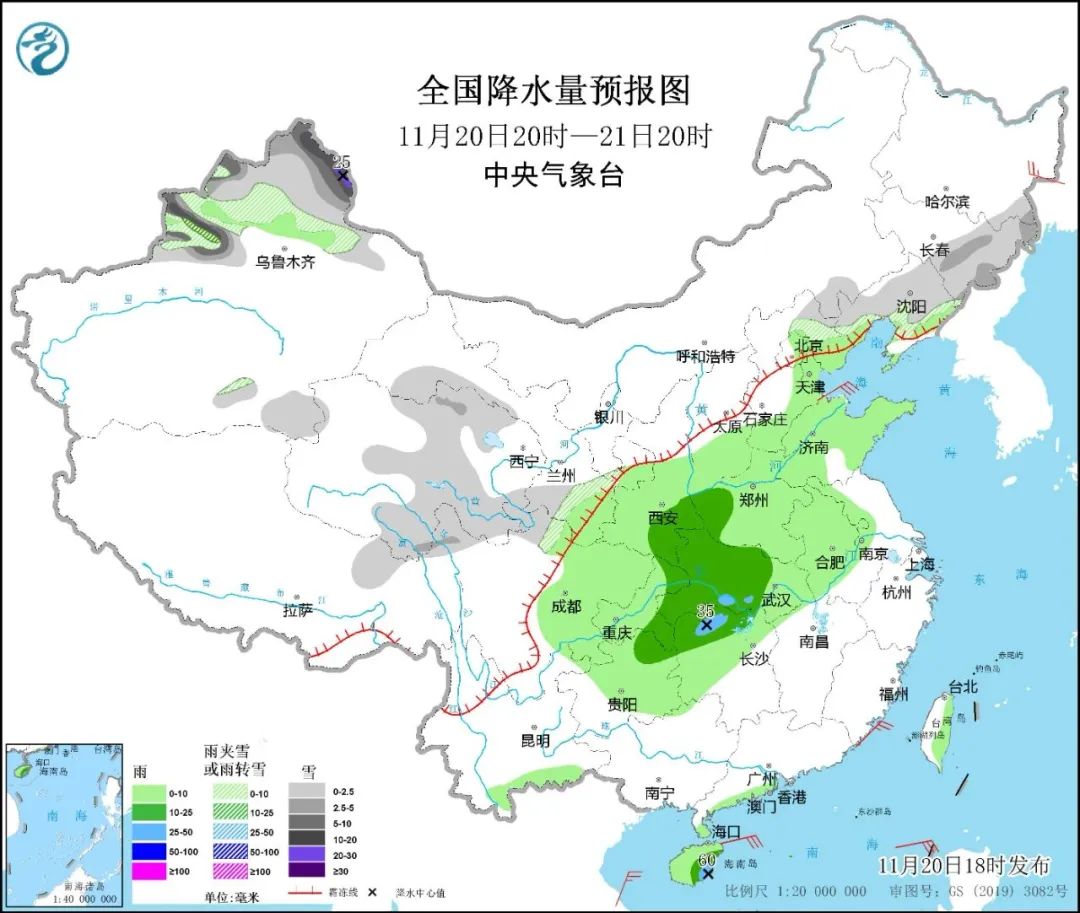 20日20时至21日20时,东北地区南部、新疆北部、青海中东部、甘肃南部、川西高原北部等地部分地区有小到中雪或雨夹雪,其中,新疆北部高海拔地区有大到暴雪,局地大暴雪。西北地区东部、华北东部和南部、黄淮大部、江淮西部、江汉、江南北部和西部、西南地区东部、广东西南部沿海、海南岛等地部分地区有小到中雨,局地有大雨。