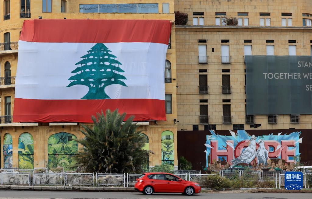 11月22日,一辆汽车驶过黎巴嫩首都贝鲁特街头悬挂的巨型国旗。当日是黎巴嫩独立79周年。新华社记者 刘宗亚 摄
