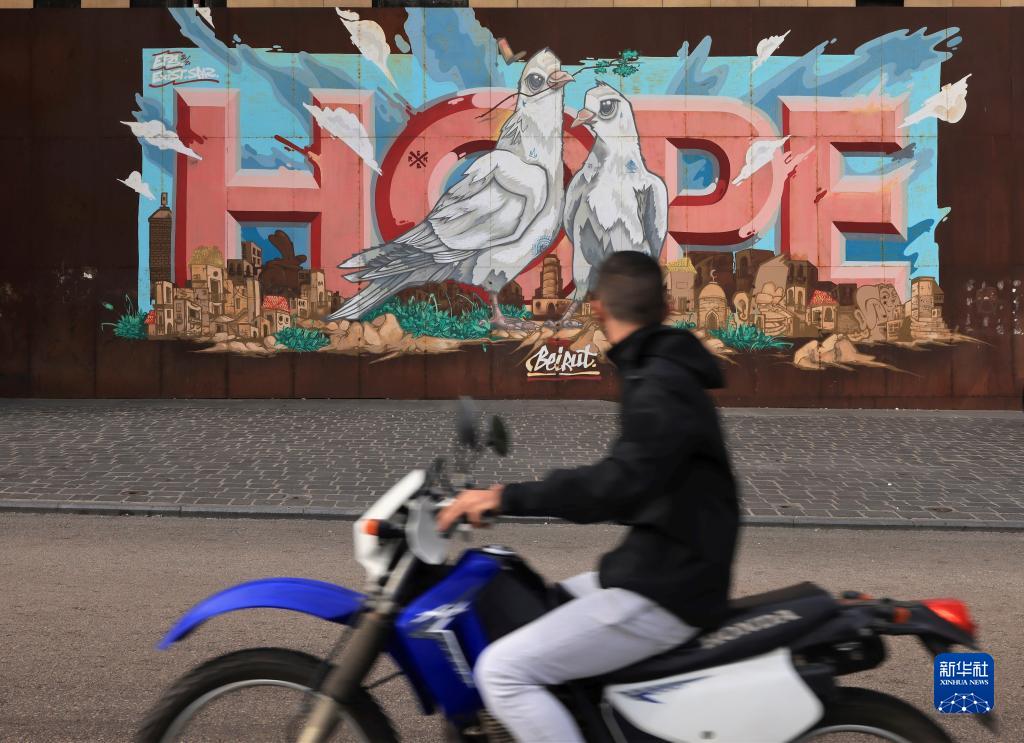 11月22日,一名男子骑车经过黎巴嫩首都贝鲁特街头,街边的标语上绘有和平鸽和“希望”的字样。当日是黎巴嫩独立79周年。新华社记者 刘宗亚 摄