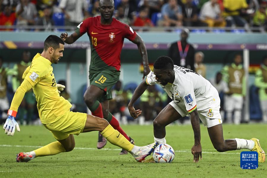 11月24日,加纳队球员伊纳基·威廉姆斯(右)在比赛中抢断葡萄牙队守门员迪奥戈·科斯塔(左)。当日,在卡塔尔多哈974球场进行的2022卡塔尔世界杯足球赛H组比赛中,葡萄牙队以3比2战胜加纳队。新华社记者 李尕 摄
