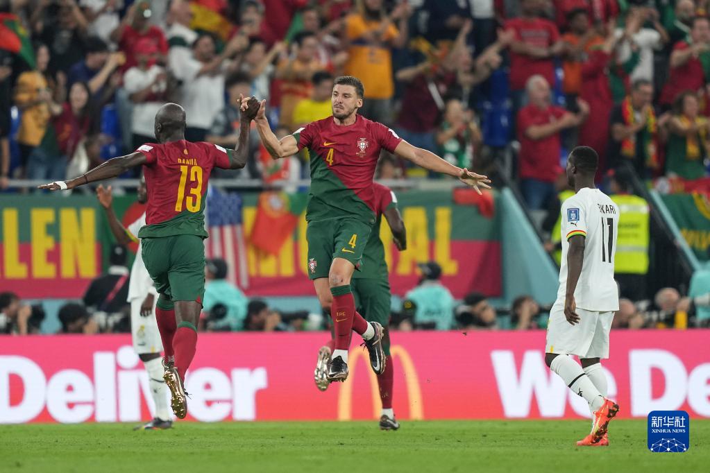 11月24日,葡萄牙队球员鲁本·迪亚斯(中)与队友达尼洛·佩雷拉在比赛中庆祝球队得分。当日,在卡塔尔多哈974球场进行的2022卡塔尔世界杯足球赛H组比赛中,葡萄牙队以3比2战胜加纳队。新华社记者 李钢 摄