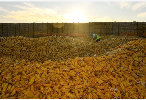在北大荒集团北安分公司赵光农场有限公司,工作人员在一处晒场的玉米堆上忙碌(2022年10月19日摄)。新华社记者 王建威 摄