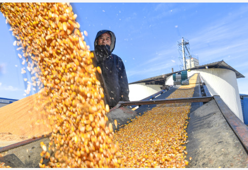 农民在吉林省公主岭市环岭街道土城子村志和农机服务专业合作社分拣收获的玉米(2022年11月1日摄)。新华社记者 许畅 摄