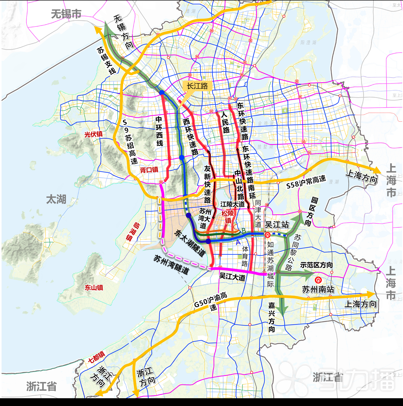 从太湖“双隧”建设示意图上可以看到,两条隧道建成后将有效打破太湖阻隔,打通苏州南北向跨太湖交通节点。作为市区跨组团出行的联系通道,两条隧道“缝合”了吴中、吴江,加强了两地核心区之间的可达性,加密了苏州西南区域的骨干路网,同时分流了快速路网的通行压力,可以更好地为高新区、吴中区、吴江区的中长距离出行服务。