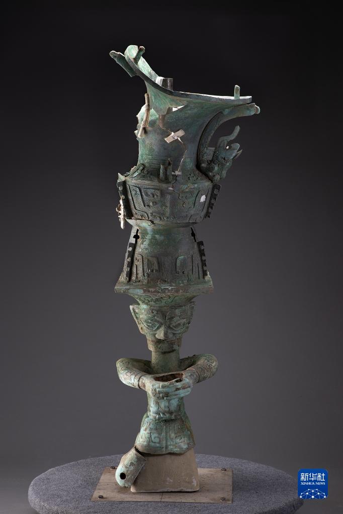 这是3号“祭祀坑”铜顶尊跪坐人像(资料照片)。 记者2日从四川省文物考古研究院获悉,考古学家利用数字三维模型实现了三星堆3号“祭祀坑”铜顶尊跪坐人像与8号“祭祀坑”神兽的成功拼对。 新华社发(四川省文物考古研究院供图)