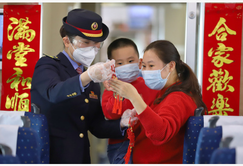 1月6日,工作人员向旅客赠送新年饰品。当日,中国铁路南昌局集团有限公司南昌客运段的工作人员在G5305次列车与旅客一起挂中国结、贴春联,营造喜庆气氛。新华社发(丁波 摄)