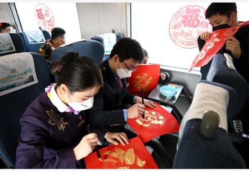 1月6日,铁路工作人员在列车上为乘客写“福”字。新华社记者 黄博涵 摄