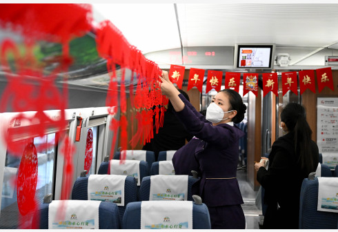 1月6日,铁路工作人员在装扮列车车厢。中国铁路上海局集团有限公司合肥客运段组织工作人员,将G8341次列车装扮一新,在列车上举办“情暖回家路”主题活动。猜谜语、演唱黄梅戏、手写福字送祝福,让乘客在旅途中感受节日氛围。新华社记者 黄博涵 摄