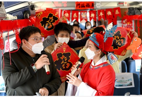 1月6日,铁路工作人员和乘客在列车上一同演唱黄梅戏。新华社记者 黄博涵 摄