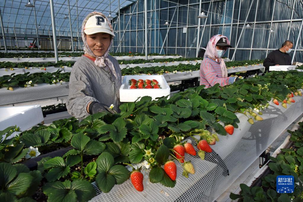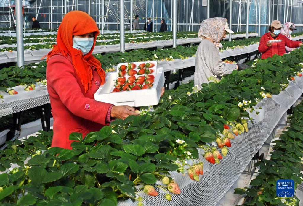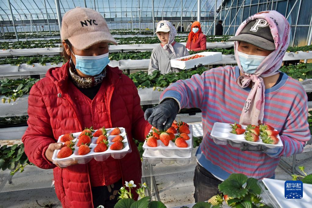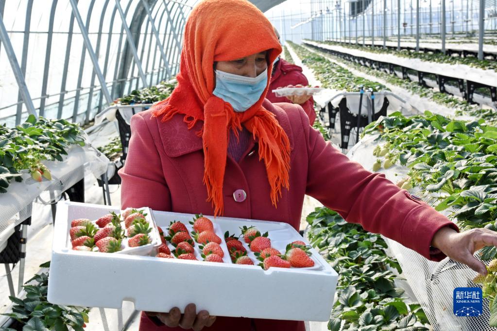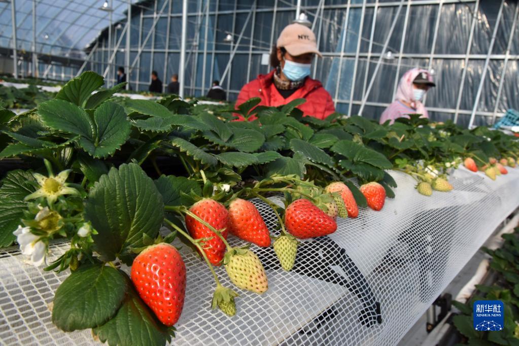 1月11日,山东省平度市旧店镇东店子村村民在智能温室采摘草莓。近日,山东省平度市旧店镇无土栽培草莓成熟,陆续供应市场。据介绍,这些草莓都是客商提前预定的春节鲜果,产销精准对接、按单科学种植,有效提升了当地特色农产品的种植规模和效益。新华社记者 李紫恒 摄