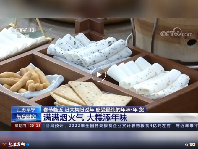 春节马上就要到了,各地年货市场商品丰富,供应充足。在江苏盐城阜宁穆沟古村,不少游客来到这里购买当地的特色美食——阜宁大糕。