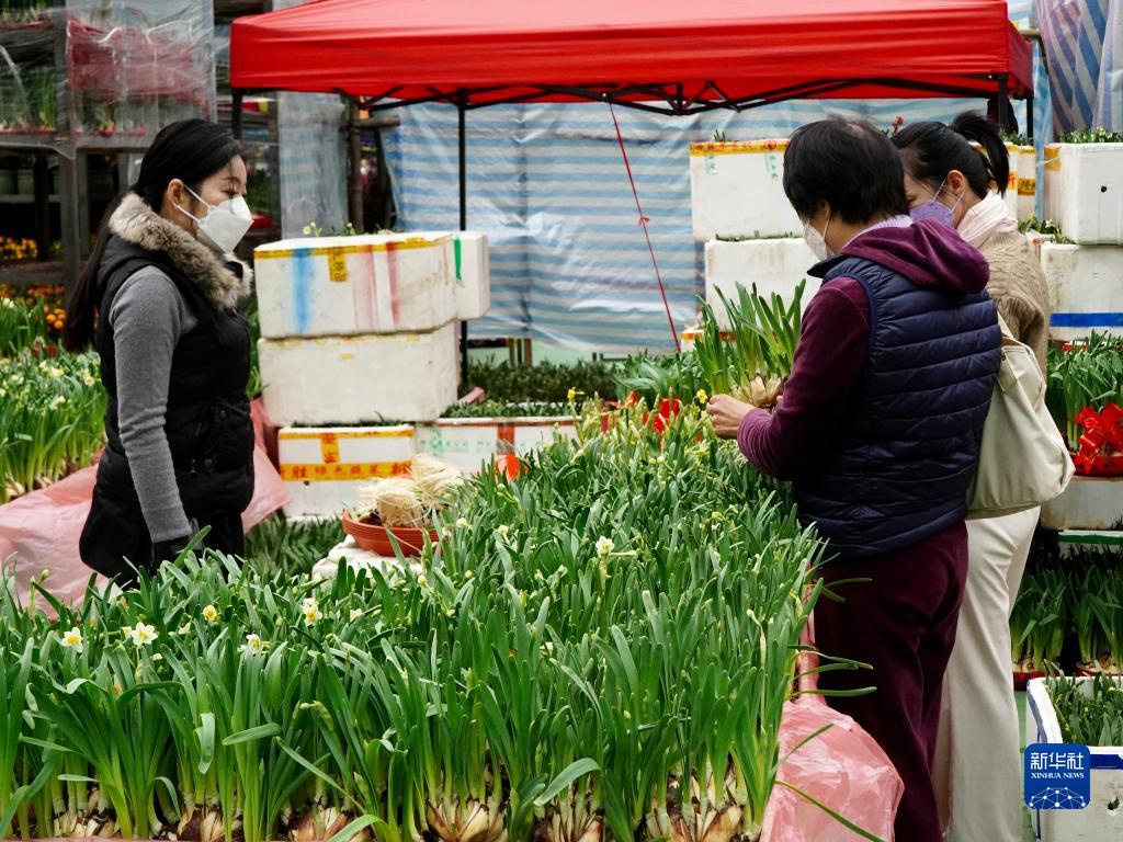 1月16日,在维多利亚公园年宵花市,顾客在选购水仙。新华社记者 褚萌萌 摄