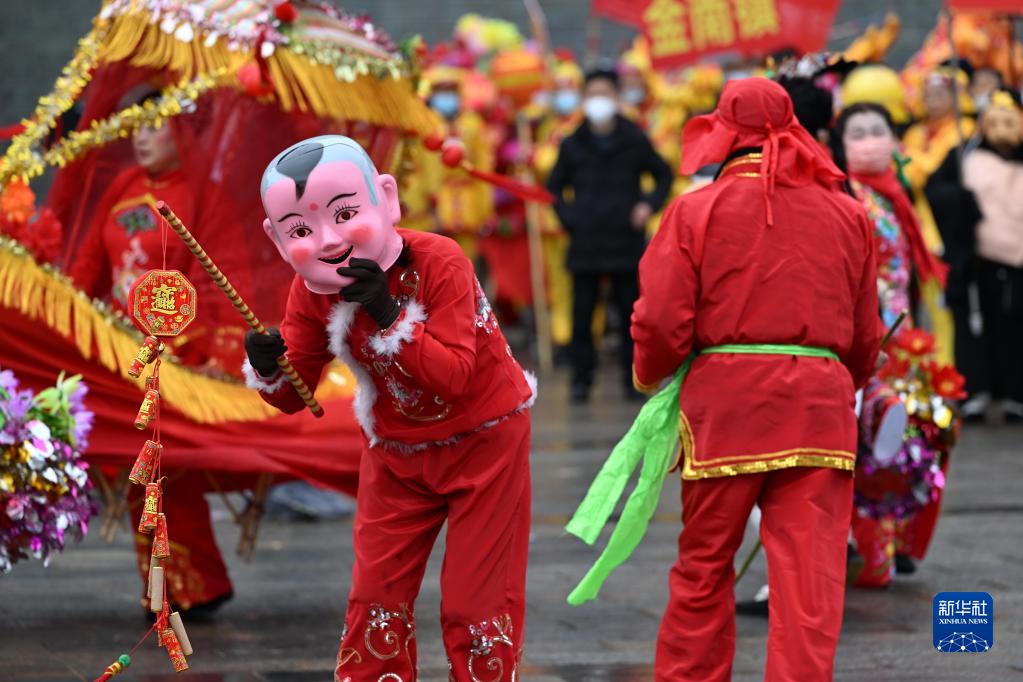 1月23日,在江苏淮安金湖县尧帝古城广场,民间艺人扮演福娃娃进行演出。春节假期,处处洋溢着浓浓的年味,人们在喜庆的氛围中欢度新春佳节。新华社发(梁德斌摄)
