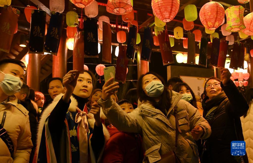 1月22日,游客在四川省南充市蓬安县相如故城猜灯谜。春节假期,处处洋溢着浓浓的年味,人们在喜庆的氛围中欢度新春佳节。新华社发(刘永红摄)
