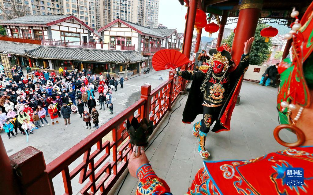 1月23日,在四川省遂宁市西部唐都,川剧演员为市民表演川剧绝活“变脸吐火”。春节假期,处处洋溢着浓浓的年味,人们在喜庆的氛围中欢度新春佳节。新华社发(钟敏摄)