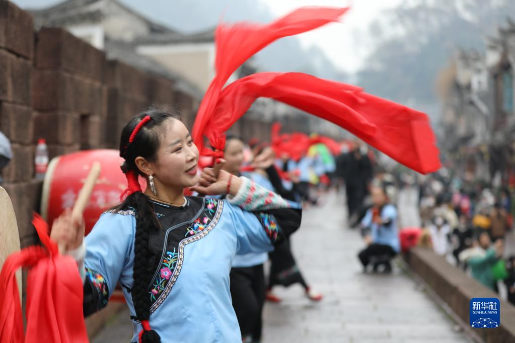 1月23日,在湖南省湘西土家族苗族自治州凤凰古城,演员在进行苗鼓表演。春节假期,处处洋溢着浓浓的年味,人们在喜庆的氛围中欢度新春佳节。新华社发(彭彪摄)