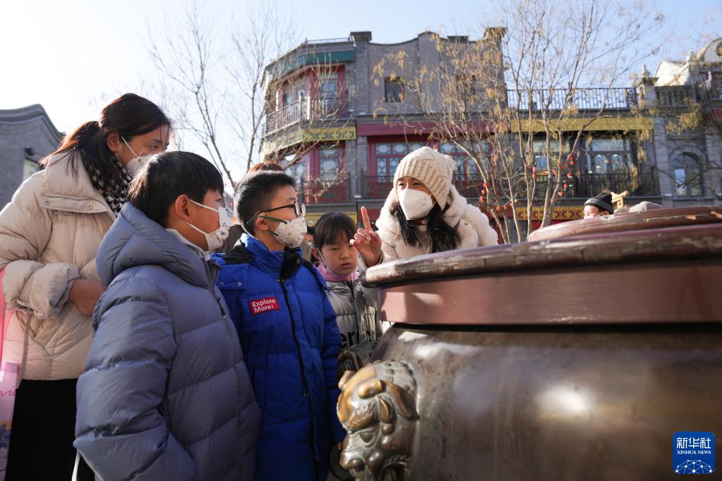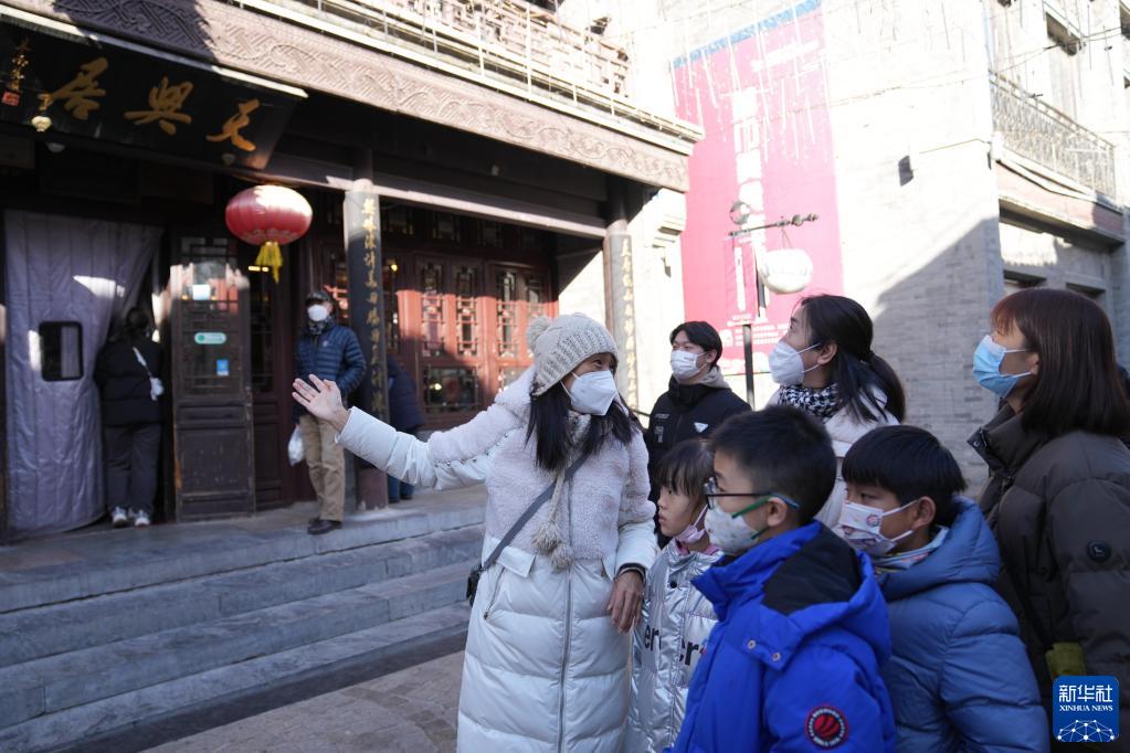 1月28日,在北京市前门大街,导游何静(右一)在为游客讲解。新华社记者 鞠焕宗 摄