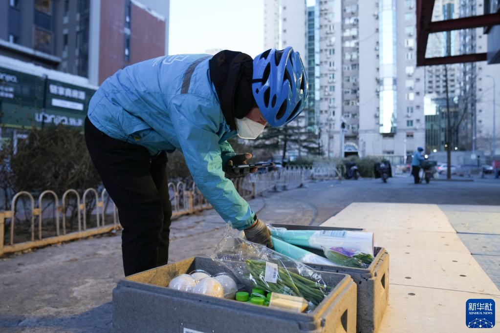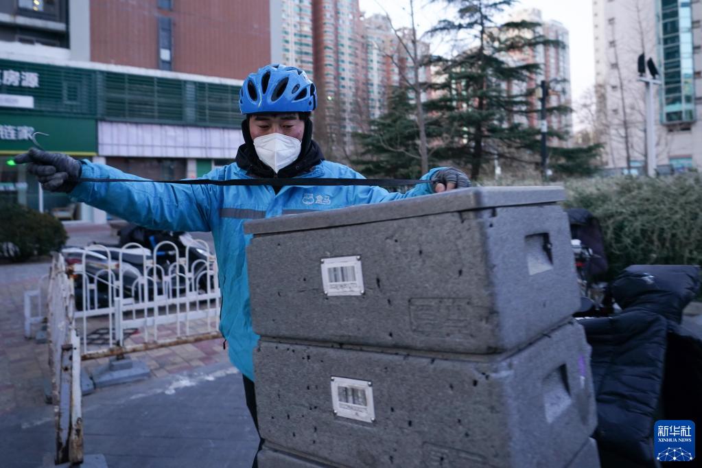 1月28日,在盒马鲜生北京十里堡店,配送员侯殿彬在打包固定要配送的第一单商品。侯殿彬32岁,来自内蒙古赤峰市,在盒马鲜生工作了三年。他希望兔年自己能多挣钱,常回家,家人和孩子都健健康康。当日是春节假期后开工第一天,各行各业的劳动者从“假期模式”切换回“工作模式”,迎来了兔年开工第一单,记者用镜头记录下他们奔忙的身影。新华社记者 鞠焕宗 摄