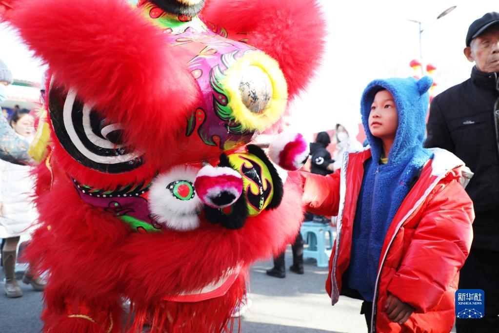 1月30日,在河北省唐山市丰润区沙流河镇皇亲庄村,小朋友被舞狮表演吸引。 元宵佳节将至,各地开展猜灯谜、赏花灯、社火表演等活动,热热闹闹迎接元宵节。 新华社发(朱大勇摄)