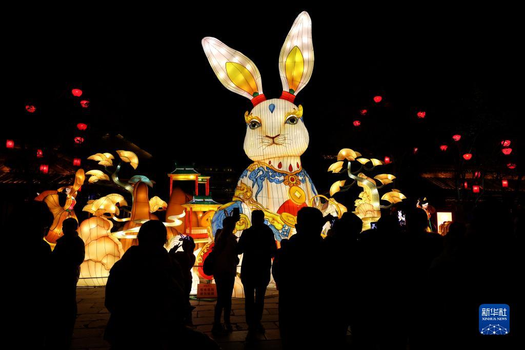 1月30日,在山东省枣庄市台儿庄古城,游人在欣赏以“兔”元素为主题的花灯。 元宵佳节将至,各地开展猜灯谜、赏花灯、社火表演等活动,热热闹闹迎接元宵节。 新华社发(孙中喆摄)