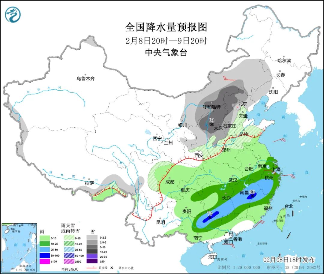 8日20时至9日20时,内蒙古中部、吉林西部、辽宁西部、西藏东部、西北地区东部、华北、河南北部等地部分地区有小到中雪或雨夹雪,其中,内蒙古中部、陕西北部、山西中北部、河北中北部等地部分地区有大到暴雪。江南、华南北部等地部分地区有中到大雨,其中,湖南西南部、江西中部、福建西北部、广西东北部等地局地有暴雨。